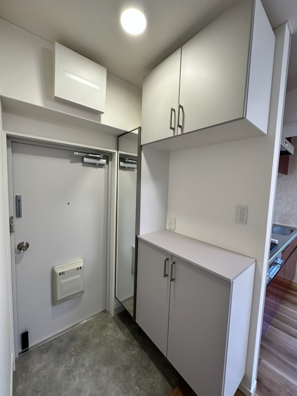 玄関収納を増やし、扉は鏡付き。靴たくさん入ります