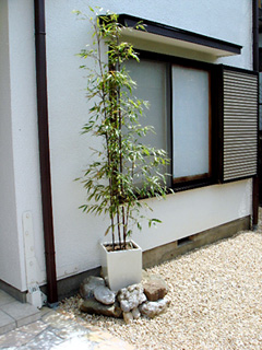 玄関横の黒竹の鉢植えは、竣工祝いに差し上げたプレゼント。
