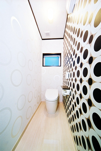 一面アクセントのトイレ・壁紙でこんなに変わる! レトロモダンがお気に入りのご主人の趣味にあわせて、全室が和室という2階を、洋風に改装。 木部はダークブラウンに塗り、壁は白を基調としたクロスに張替え、新築同様に変化する中にも既存の古い家屋の空気を残しました。 トイレは、ドアの位置を変えて空間を広げ、癒しの場所に。 閉ざされた狭い中で思い切りレトロモダンを味わえるような内装を提案し、個性的な壁を一面だけに配置して暗くならないように配慮しました。 |