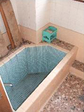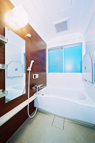 | 在来の浴室は、使い勝手のいいユニットバスにしましたが、一面はダークブラウンの色を使って温かみを出しました。 ユニットバスで、こんなに変化! |