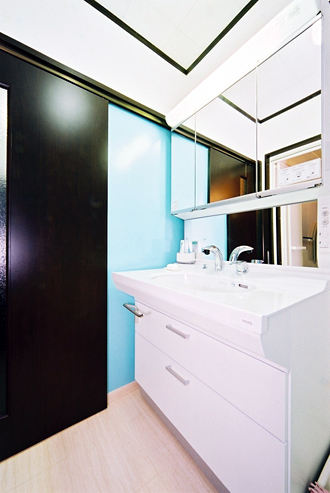 | 洗面室は壁の一面を青みのはいった水色にして、清潔なイメージの中にもレトロ感覚を強調。 使い勝手も良くなりました。 古びた水廻りからは想像もできなかった、新築同様の設備で、非常に満足していただいています。 モダンのなかにも、ところどころにレトロな雰囲気が感じられるので、非常にくつろげる空間になりました。 |