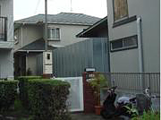 (4)![]() 横に仮囲いが迫っている玄関。黒の屋根、ベージュの外壁。 |