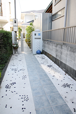 (2)![]() 道路から門扉までの演出は、コンクリートに埋め込んだ碧い石。 |