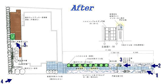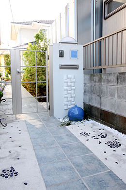 仮囲いとの統一感を出すために、門扉・ポスト・照明器具をシルバー色で統一。 通路の真ん中にブルーグレーのタイルを1直線に通して、コストダウンのためにそれ以外の部分はコンクリート金ゴテ仕上げ。アクセントに碧いガラス風の石を散りばめました。 門塀の前には、ブルーの陶器のオブジェを設置。奥様が第一印象からこれに決めていたという青いガラスの表札と共に、W様宅の新しいシンボルに。 | |