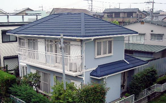 (4)![]() 葺き替えた青い屋根、塗り替えたブルーの外壁。 |