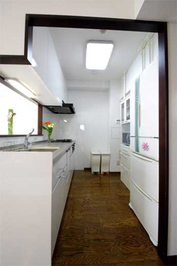 2.側面の壁を撤去し、サイドパネルにすることでキッチンの長さを伸ばして収納を確保。