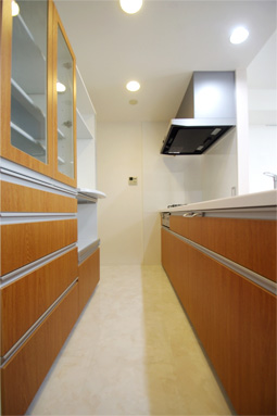 ①奥さまがお好みのライトオークのキッチンに合わせ、ベージュ系の光沢の有るフロアタイルを御提案しました。