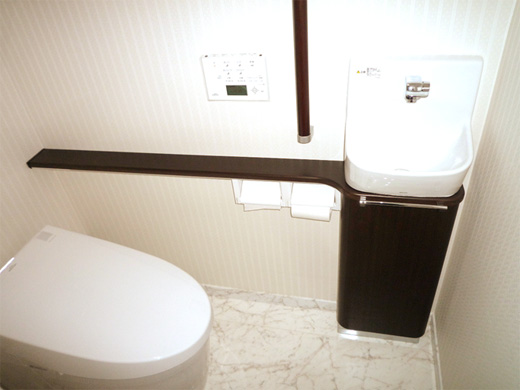 ・トイレに手洗器の設置と一緒にバリアフリーを考慮し、肘掛や手すりの設置。