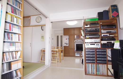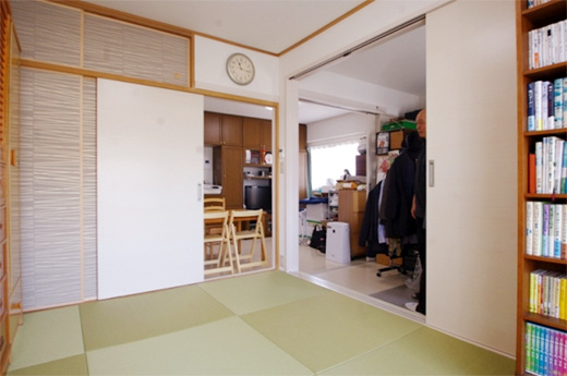 LD、和室、ご主人の書斎が閉鎖的だったのを、壁を撤去し、引き戸によってオープンな空間になるようにした。
