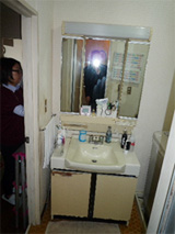 洗面所の開戸が廊下側に開く為、邪魔になる。