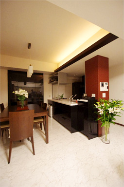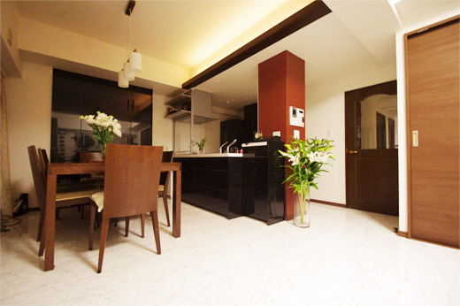 ビアンコの白い床に、ブラックのキッチン、ブラウンの家具、朱色をアクセントにした柱とキャンドルライトの間接照明が落ち着いた雰囲気のスペースを演出しています。