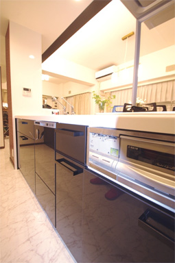 ②ダイニング側からキッチンが見えるので、ご主人様も料理に興味を持ち始め、台所に立つようになりました。