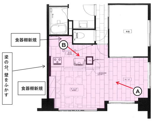 ③新規の食器棚を2ヶ所に設け、凹凸の多い梁をうまく隠して活用した。