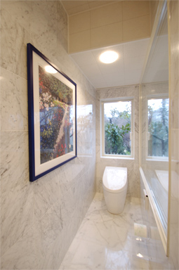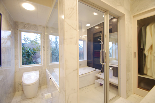 お施主様のご希望で、床・壁の大理石張りはお客様ご自身の手で施工されました。