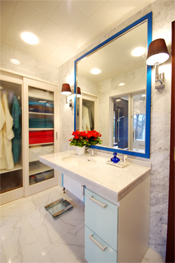 4.トイレから見たユニットバスと洗面化粧台。大理石張りの床、壁とカウンターが調和。