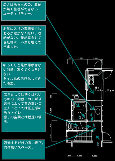 ウォシュレットの交換から弊社とのお付き合いが始まり、今回、老朽化し不満が募った水回りを改装するに当たり、水のことはやはりプロにお任せしようと言うことで解放をテーマにした改装計画がスタートしました。