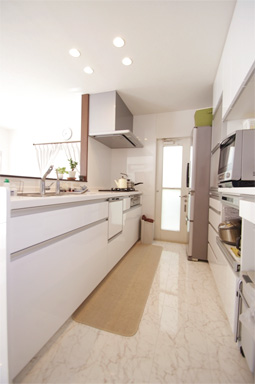 ①キッチン:キッチンを15cm前に移動し、食器棚との間隔を90cmにして吊戸棚を撤去しLDKを一体にしました。