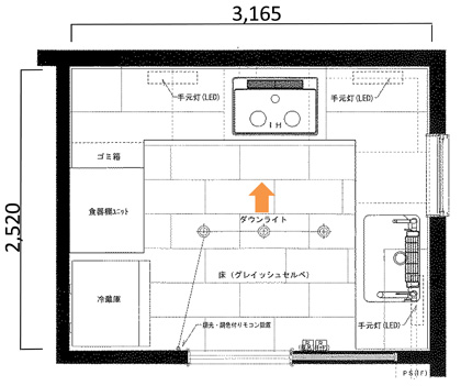 ③調光・調色のできるLEDダウンライトでキッチンの雰囲気に変化が出ました。