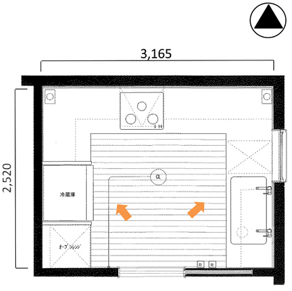 ①ご主人様と二人で立って調理できるように、シンク左スペースとコンロ左スペースを広く取りました。