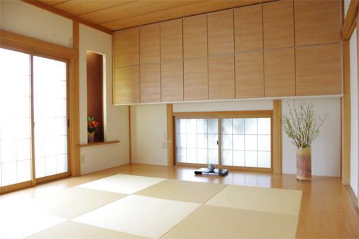 ③90cm角のヘリなし畳、回りを板張りで囲い、窓上収納を有効に設置した。