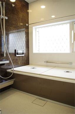 浴室もバリアフリーで断熱型の浴槽に交換。天井にはミストサウナ。
