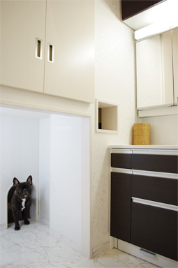 使用されていないサウナ室は、洗面所の収納に、下部には愛犬のトイレスペースに変更。