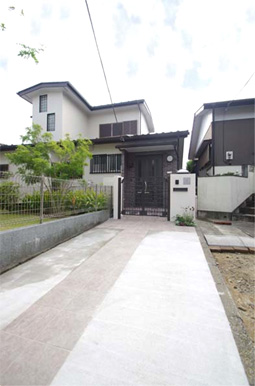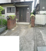 1.完成後のアプローチ。車のタイヤが通る部分はコンクリート金ゴテに、通らない真ん中の部分から玄関の内部まで300角タイルを貼って高級感あふれる玄関に変身。