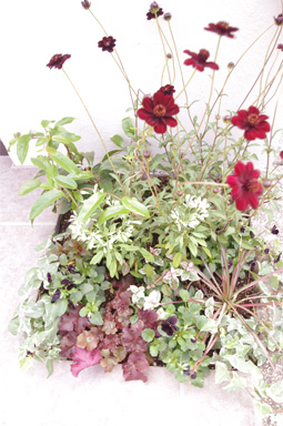 5.チョコレートコスモス・美男カズラ・白雪姫を中心に、色合いをコーディネートした寄せ植え。